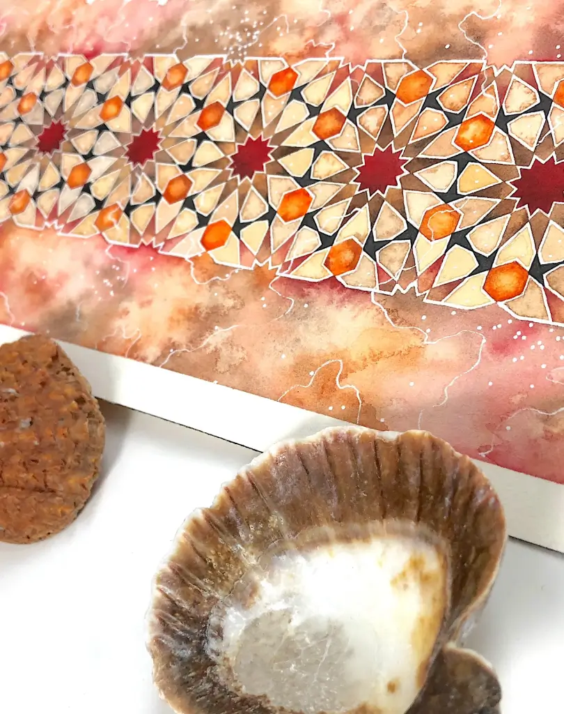 The design features geometric patterns and floral motifs rendered in warm tones reminiscent of spices and washes of watercolours.
